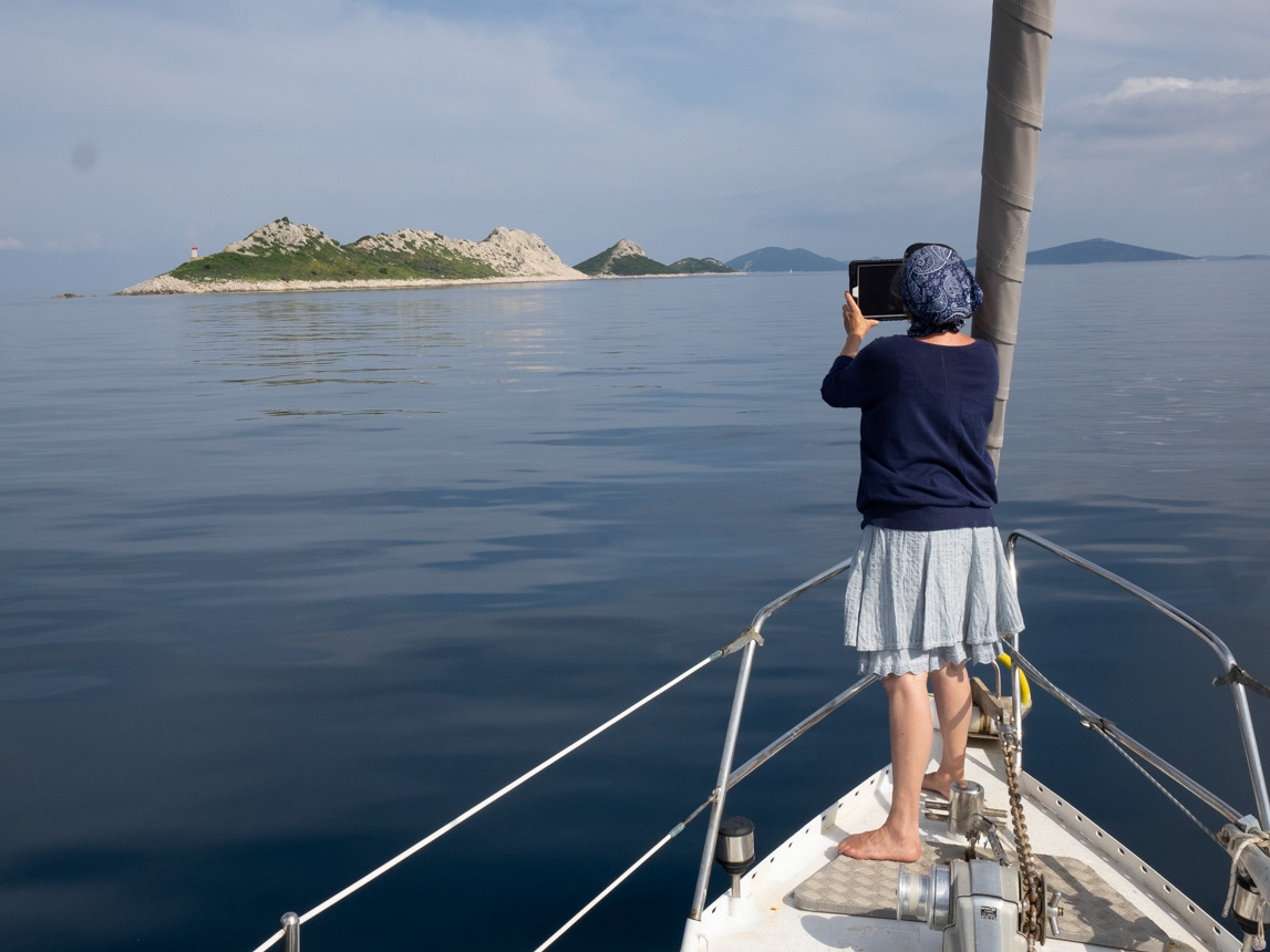 Wir motoren weiter und sehen Delfine, ein Aufsteller. In der Bucht Zapodaski auf Losinj lassen wir den Anker fallen. Es gibt eine unruhige Nacht, Wind kommt auf und ein Gewitter entlädt sich in den frühen Morgenstunden, wir schwoien stark, der Anker hält.
