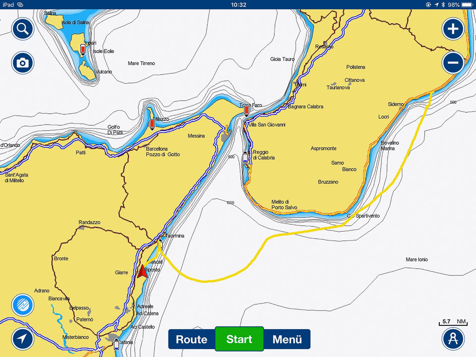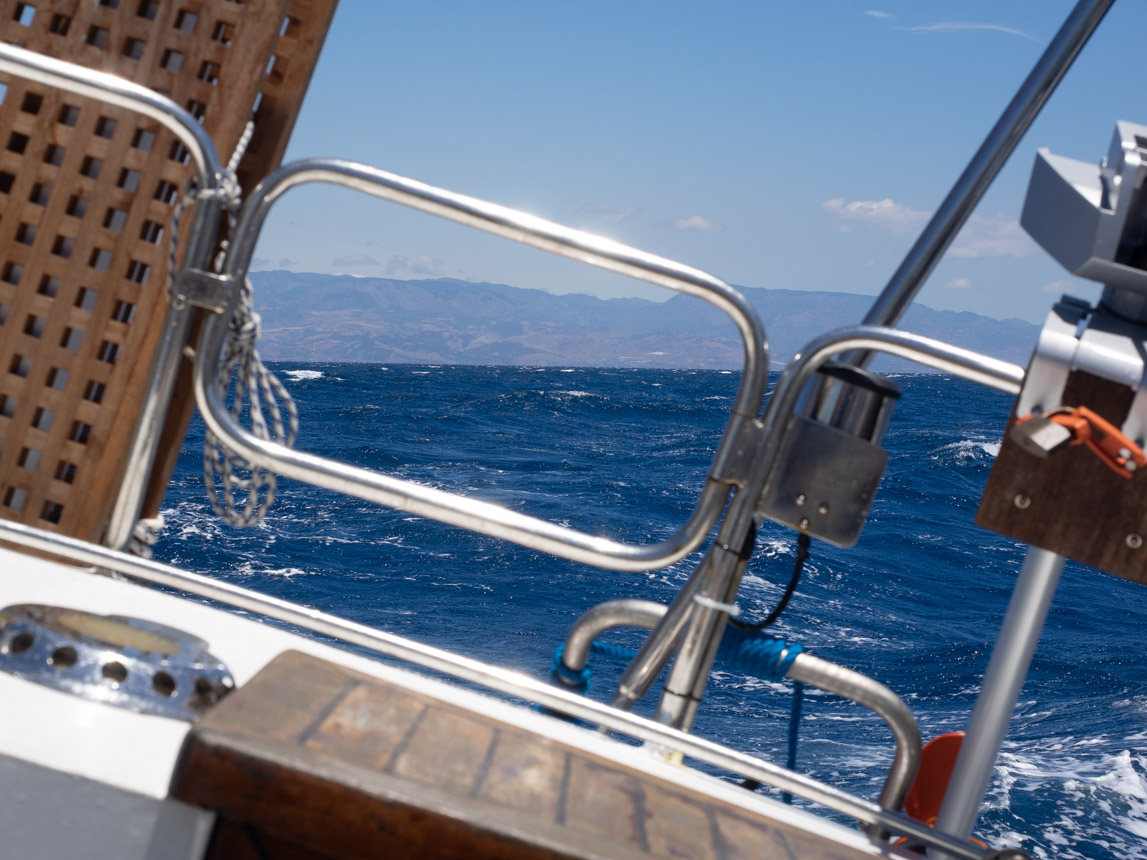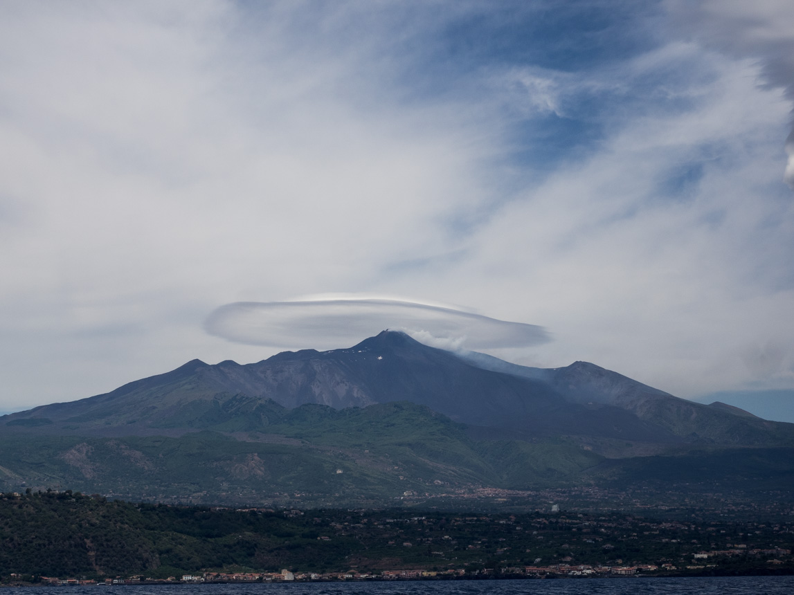 Angenehm raumer Wind schiebt uns am nächsten Tag gemütlich in Richtung Sizilien, der rauchende Aetna steht majestätisch vor uns, keine Wolken verdecken ihn. Am Horizont sind Schaumkronen, wir kommen in die Strasse von Messina, reffen, Starkwind mit 6-7 Bf empfängt uns, wir segeln hart am Wind mit über 7 Knoten, viel Druck, viel Lage, unangenehm! Wir müssen abfallen, fahren nun nach Süden in Richtung Afrika, können dank dem rechtsdrehenden Wind kontinuierlich anluven und erreichen unser Ziel Naxos Giardino. Im Hafenbecken steht Schwell, also weiter nach Riposto mit Rückenwind, in die Marina dell Etna. Müde und zufrieden hören wir den Vulkan rumpeln!