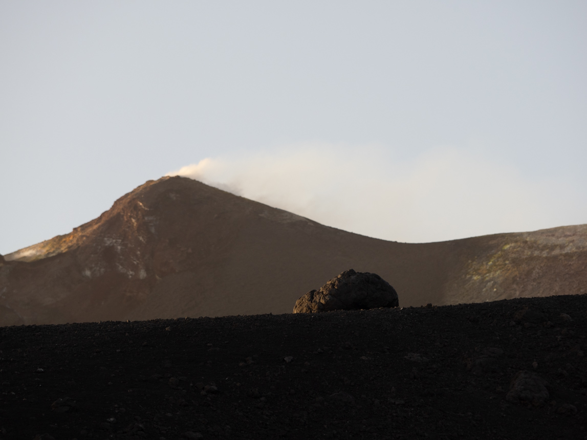 Wir haben die Sunset-Aetna-Tour gebucht. Während der einstündigen Fahrt durch verschiedene Vegetationszonen unterhält uns der umtriebige Reiseleiter Alfredo. Auf 1900 Metern (Rifugio Sapienza) steigen wir in ein geländegängiges Fahrzeug, das transportiert uns auf der staubigen Piste bis auf 2700 Meter. Zu Fuss mit dem kundigen und engagierten Bergführer Peppe gelangen wir nach 45 Minuten zu den rauchenden Kratern. Durch das Geröll rutschen wir anschliessend hinunter.