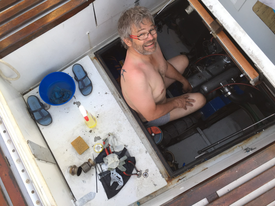 Die Wellendichtung tropft, es blieb nicht Zeit, wirklich alles optimal herzurichten. Die Fusspumpe fürs Wasser zieht Luft, die Wellendichtung tropft in den Wellenschacht, die Seewasserpumpe für die WC-Spülung ist etwas leck, korrodiert.