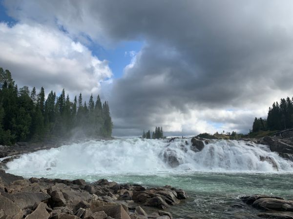 Auf einer der vielen Fähren überqueren wir bei Regen den Polarkreis, nun sind wir gefühlt definitiv im Süden. Am Nachmittag bessert sich das Wetter, wir fahren entlang eines mäandrierenden Flusses und machen Halt beim Laksforsen, einem schönen Wasserfall! Im Velfjord Camping und Hytter, der wohl schönsten Unterkunft in Mittelnorwegen, geniessen wir zwei herrliche Tage, bevor wir weiterfahren, und nach drei Wochen wieder in Trondheim ankommen. Die Merci ist in tadellosem Zustand, wir machen Grosseinkauf mit dem Auto, räumen auf und ein.