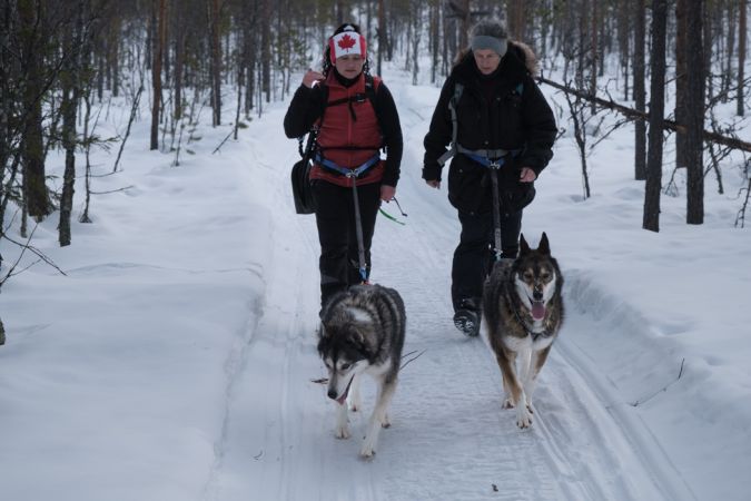 Am nächsten Morgen machen sich Marie-Laure und Thomas bereit zur Schlittenhundefahrt mit Jo, wir sind mit Emma und Rentnerhunden unterwegs, «canirando». Emma will den kommenden Sommer in Skandinavien verbringen vielleicht kreuzen sich unsere Wege irgendwo in Norwegen?
