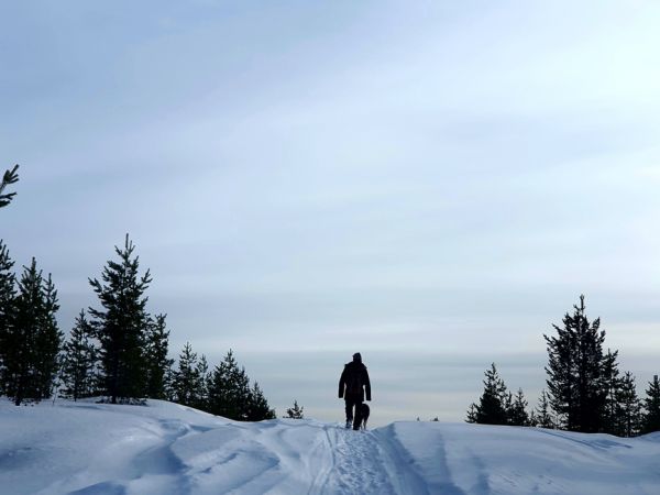 Wunschprogramm am letzten Tag: wir entscheiden uns heute für einen gut 20km langen Hundeschlitten-Vormittag. Sandrine führt uns durch eine eher flache Gegend, Seen wechseln sich mit Wäldern und Mooren ab. Am Nachmittag versuchen wir uns im Eisfischen. Wir bohren Löcher, legen oder setzen uns bei -10 Grad daneben und lassen die kurze Rute ins Loch gleiten. Die Sonne verschwindet etwa 17 Uhr hinter dem Wald, es wird empfindlich kalt, wir packen unsere Sachen zusammen, die Fische lassen wir im See. Ein friedlicher letzter Tag.