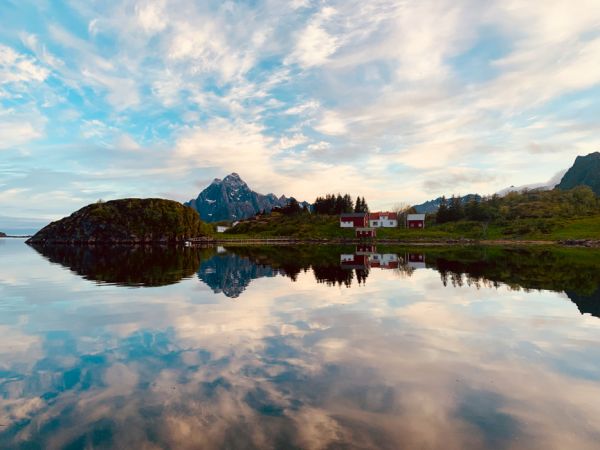 Bei diesigem Wetter legen wir ab und legen eine Stunde später in Storvågan bei Kabelvåg in einer engen, stillen Bucht an, bei der liebevoll gepflegten Rorbuer-Hotelanlage Nyvåger. Im Restaurant lassen wir uns den Wein der Marke «in cod we trust» (Cod=Dorsch) schmecken. Die Sonne ist wieder da und schickt wunderbares Licht auf die spiegelglatte Wasseroberfläche. Wir wandern um einen See, dann entspannen wir uns im Spa und der Sauna, kühlen uns im 7 Grad warmen Meer ab und sünnelen anschliessend auf der Merci. Ein geschenkter Tag!
