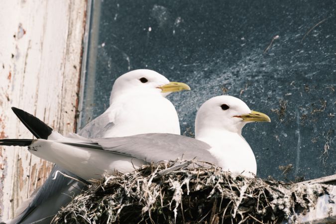 Morgens um 5 Uhr legen wir bei Sonne und Wind aus SSW ab, hissen die Segel und rauschen mit 7 Knoten westwärts, vor uns leuchten die verschneiten Berge von Andøya in der Morgensonne. Um 11 Uhr sind wir im Hafenbecken von Andenes, die Stege sind belegt mit Schifferbooten. Im Süden vom Osthafen finden wir einen Platz, der Hafenmeister gibt sein okay. Wir machen einen Spaziergang durch das noch verschlafene Dorf, im Sommer wimmelt es hier von Touristen. Am Strand treffen wir einen Einheimischen, er putzt den Strand; erschreckend, was da alles angeschwemmt wird. Etwas abseits sitzen 3 Adler auf Steinen am Ufer. Im Hafen sitzen Dreizehenmöwen zum Brüten auf schmalsten Fensterbrüstungen. Fisch wird angeliefert und verarbeitet, wir können keinen kaufen, sind auch als Zuschauer eher unerwünscht.