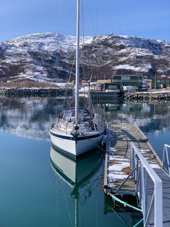 Wir pflügen uns durch das glatte Wasser, werden vom Hurtigrutenschiff «Nordnorge» überholt und machen nach 25nm am Nachmittag in Sommarøy am Steg fest. Dreizehenmöwen und Austernfischer fliegen kreischend umher, eine Gruppe Eiderenten im Prachtkleid zeigt sich im Wasser. Der Matkroken ist auch hier Einkaufsladen, Post und Begegnungszentrum. Im Café «Havnefrua» trinken wir auf der Terrasse ein Bier in der Frühlingssonne und bewundern die (noch) verschneite Umgebung. Saisonstart geglückt!