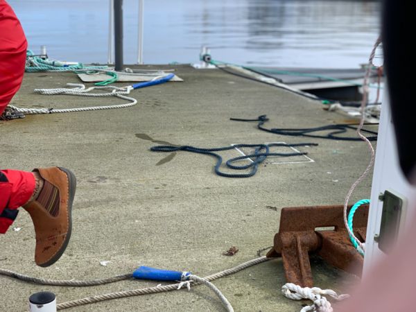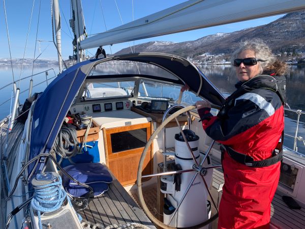 Camille und Jann aus der Bretagne leben auf ihrer Aegir (F), sie liegen neben uns am Steg und kommen auf einen Apero zu uns. Es ist um die 0 Grad, zeitweise schneit es, wir heizen und gehen im Schneegestöber einkaufen. Eine Robbe lebt im Hafenbecken, sie zeigt sich immer wieder. Am Morgen liegt etwas Schnee auf dem Schiff, wir müssen uns an die Tankstelle verholen, der Besitzer dieses Platzes kommt zurück. Natürlich schneit es gerade....