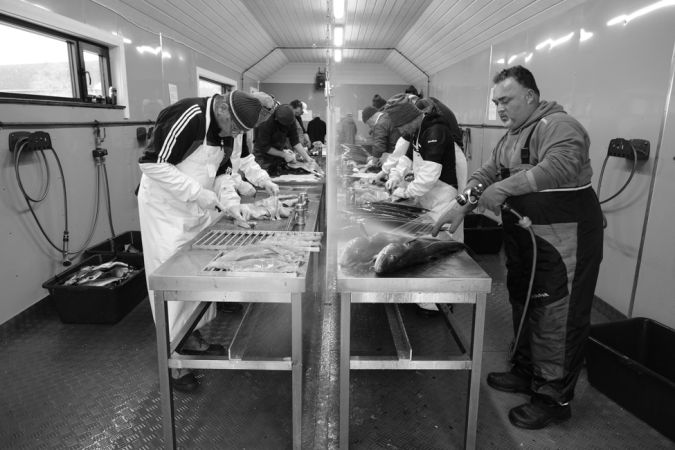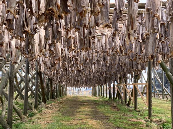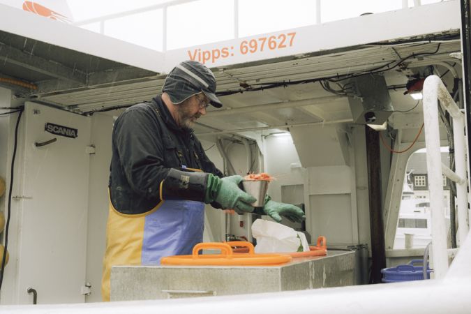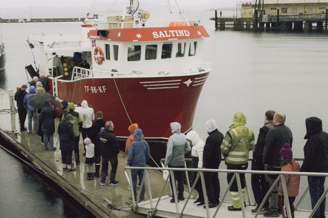 Der Wind hat sich ausgetobt, wir haben 18 Grad, die Sonne scheint nun 24 Stunden, nur sehen wir sie selten. Die «Solsand» macht fest, es bildet sich eine lange Warteschlange trotz des strömenden Regens, Crevetten werden direkt ab Schiff verkauft.
