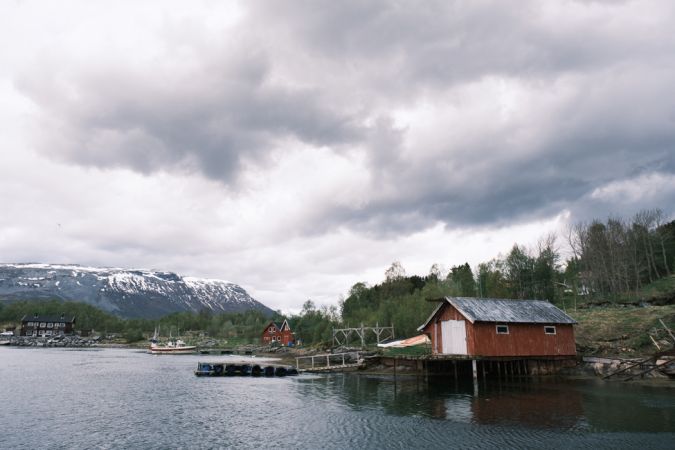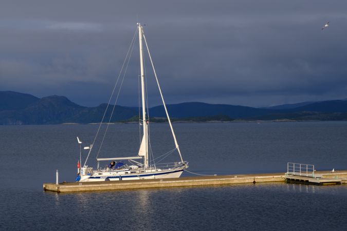 Wir legen ab und segeln los, auf den umliegenden Bergen liegt ab etwa 400 Metern Höhe frischgefallener Schnee. In Grov machen wir an einem ehemaligen Militär-Ponton fest. Kaum angemacht, beginnt es zu regnen. Das Restaurant ist geschlossen, eine riesige Werfthalle beherrscht die Bucht.