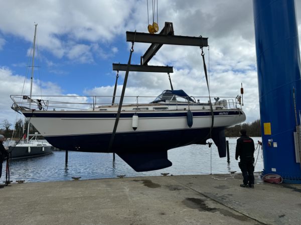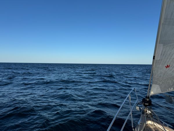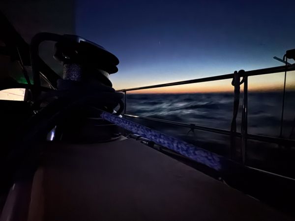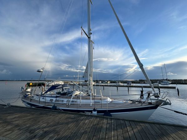 Um 10 Uhr legen wir ab in Richtung Norwegen, um 14 Uhr erwischt uns Graupel, innert kürzester Zeit liegt eine zentimeterdicke Schicht auf dem Schiff und im Cockpit. Um 16 Uhr kommt der Wind, wie angekündigt von SE mit durchschnittlich 17 Knoten, perfektes Segelwetter. Eissturmvögel fliegen elegant um die Merci, segeln knapp über der Wasseroberfläche, wunderschön. Der Wind nimmt zu, wir reffen, um 18 Uhr sind wir in einem kleinen lokalen Tief mit Windstärken bis 30 Knoten. Wir lassen die Segel gerefft für die Nacht, kommen mit 6.5 bis 7 Knoten Fahrt gut voran. Um 2030 schwimmen 4 Delfine ums Boot. Beim Kapp Lindesnes gibt es Winddreher, Böen, unruhiges Wasser, unangenehme Wellen. Dann geht’s aber wieder ruhig vorwärts, der Strom schiebt uns mit gut einem Knoten. Wir fahren entlang der Küste Norwegens, und legen am 26.4. 2024 um 13 Uhr in Tananger an, waren 26 Stunden unterwegs für 170nm.