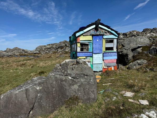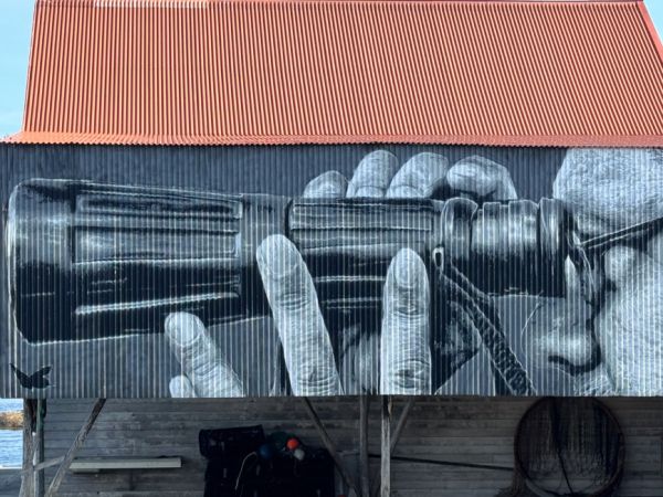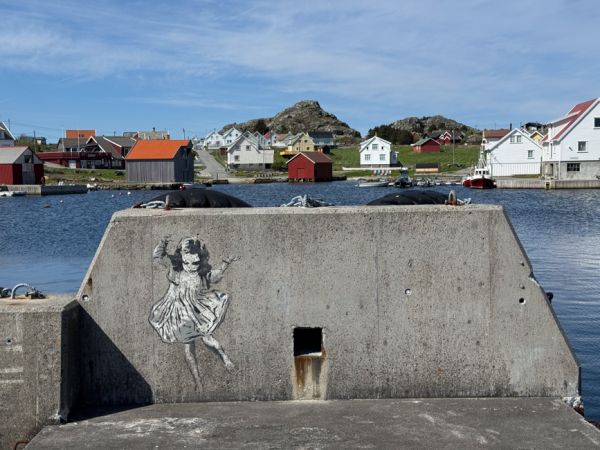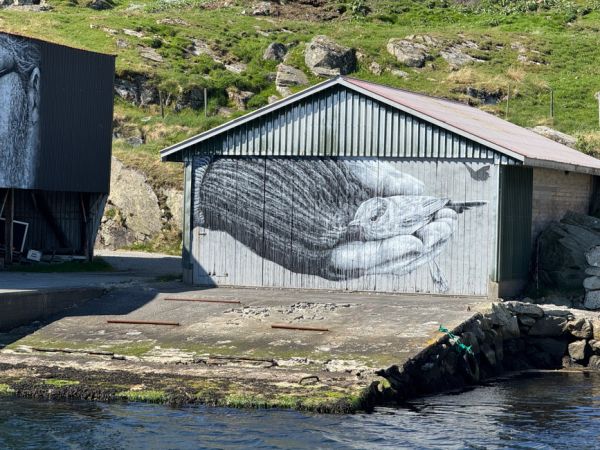 Wir wandern über Felsen und Felder und es ist unwirklich, sieht aus wie vor Tausenden von Jahren, nur die Windräder und einige Häuser sind neu. Die Insel ist seit Ende der letzten Eiszeit bewohnt. Auf einem felsigen Hügelzug thront ein riesiger Findling, seit 11000 Jahren. Aus den Feldern haben ursprünglich Fischer Steine zusammengetragen und zu langen Zäunen aufgeschichtet. Die Schwalben sind da! Auf Utsira gibt es viele Wandmalereien. Im Joker in Utsira Süd trinken wir einen Kaffee und plaudern mit dem Besitzer.