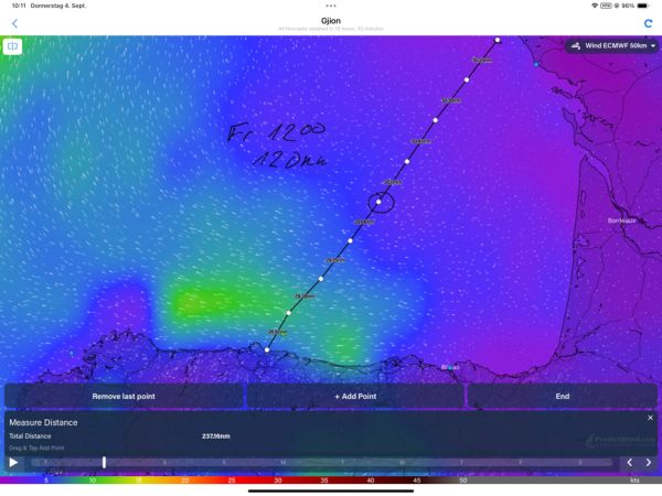 Routenplanung über die Biskaja. Nach 30 nm und 6 Stunden