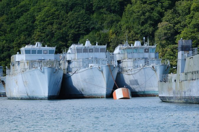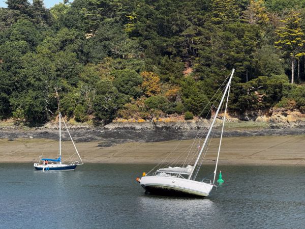 Bei leichtem Nieselregen treiben wir friedlich zur Mündung, wo uns unangenehmer Gegenwind mit 13 Knoten empfängt. In der weiten Bucht von L’Auberlac’h fällt der Anker, der Gezeitenunterschied beträgt 6 Meter, enorm.