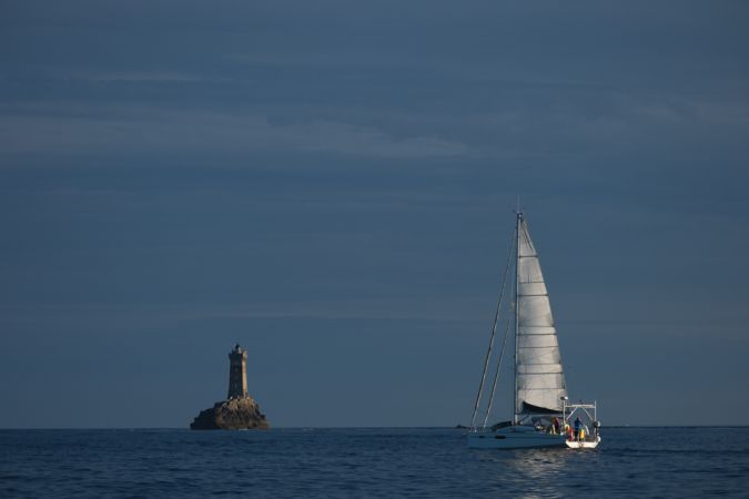 Vorbei am Leuchtturm Tévennec, nun fahren wir gegen Süden. Bald haben wir bei 11 Knoten Wind 5.8 Knoten Fahrt, im Raz de Sein bei 9 Knoten Wind 7 Knoten Fahrt. Um 17 Uhr sind wir vorbei am Leuchtturm la Vieille, fahren in Richtung Osten; und es rauscht und der Wind frischt auf bis zu 19 Knoten, wir reffen und haben über 8 Knoten Fahrt. In der grossen Bucht von Sainte Evette bei Audierne fällt der Anker. Eine spannende Rauschefahrt heute!