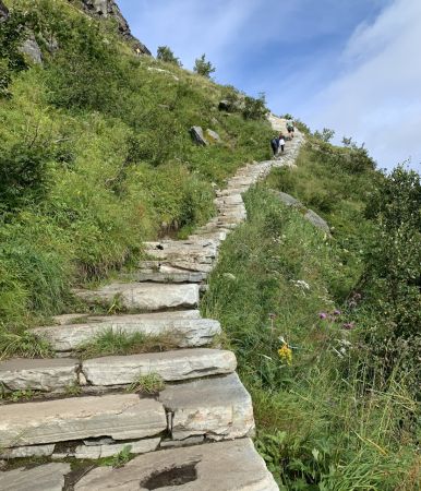 Sonne! Wir steigen die Treppe hoch zum Reinebringen. 2019 wurden lokale Steine mit dem Helikopter transportiert und von nepalesischen Sherpas zu einer Treppe verlegt. Die Aussicht ist noch spektakulärer als wir uns das vorgestellt haben.