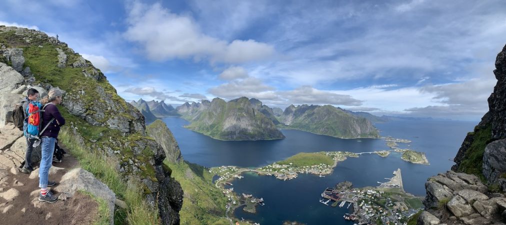 U hat Züpfe und Brot gebacken, zusammen mit dem Rauchlachs geniessen wir den exzellenten Brunch. Es ist freundlich heute, wir machen uns auf zu einer Wanderung auf anspruchsvollem Weg (hohe Stufen, rutschige Passagen, ausgesetzt, blanke Felsbänder mit Ketten versehen). Die Sicht vom „Kollfjellet“ hinunter auf Dorf und Meer, hinüber auf Seen, hinauf auf glattgescheuerte Felswände und markante Zinnen ist einmal mehr umwerfend. Im Südwesten erahnen wir den Moskenestraumen und das Ende der Lofoten.