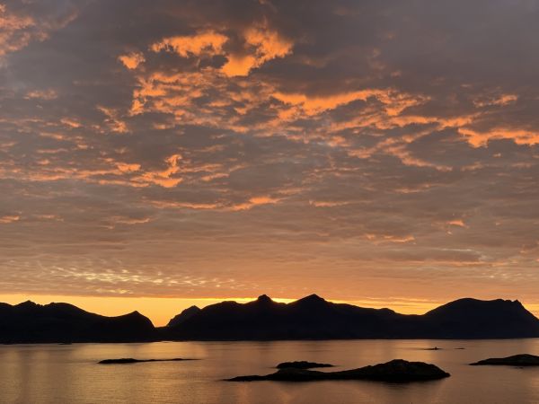 Beim „Joker“ werden wir auf berndeutsch begrüsst: Valentin, er ist mit dem VW-Bus unterwegs. Wir essen zusammen auf der merci. Beim Sendeturm sehen wir die Sonne hinter den Bergen der Lofoten verschwinden, sie färbt die Schäfchen-Wolken kitschig rosa und wirft einen Hauch orangerosa über das Wasser, wo sich zwei Delfine tummeln, kitschig schön!