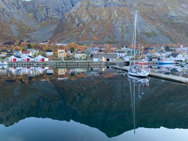Das Wasser glatt wie ein Spiegel, die Hänge der Hügel beidseits des Sundes in den prächtigsten Herbstfarben. Nach 10 nm kommt Wind auf, perfekt, wir segeln die nächsten 7 Meilen bis vor den Hafen in Sommarøy. einer kleinen Insel vor Senja. Der kleine, geschützte Steg hat Platz für 2 Segelboote, beim Campingplatz nebenan wird die Hafengebühr entrichtet, da sind auch die Sanitäranlagen mit Dusche (10nok) und Waschmaschine.