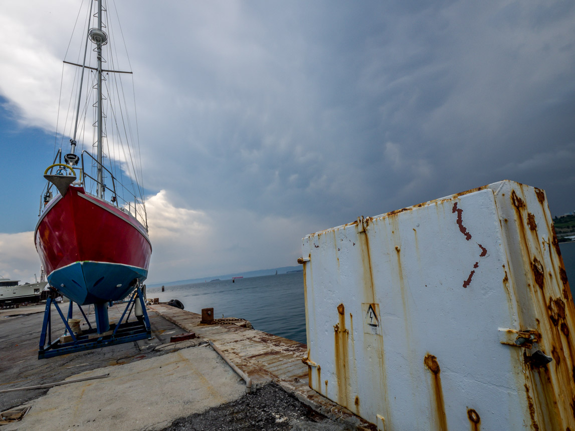 Der angekündigte Starkwind am nächsten Tag bleibt aus, die Wellen jedoch noch meterhoch, wir kämpfen uns unter Motor durch das seichte, bleierne Wasser nach Pozzallo, der Anker fällt im Schutz der Mole.