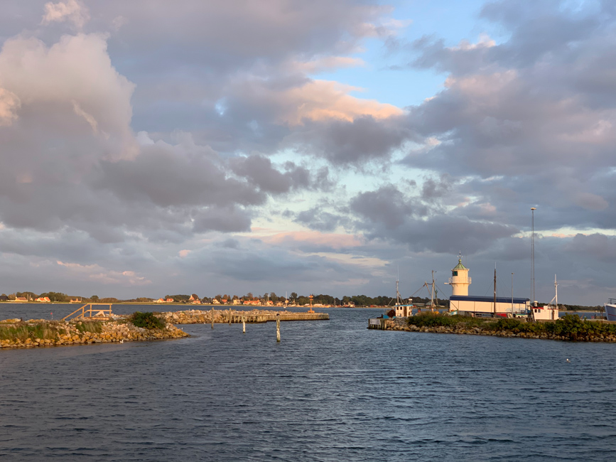 Wir kreuzen auf, bis wir in den Meerarm einbiegen können; der Wind nimmt ab, es klart auf, wir segeln durch die enge, flache, betonnte Rinne, die sich nach hinten zu einer grossen Bucht erweitert, einem Naturhafen, da liegt das idyllische Dyvig. Wir legen an und gehen zum Dyvig Badehotel, einer 4-Stern Loge, trinken einen Kaffee in einem der drei klassisch möblierten Säle. Die Aussenfassade erinnert an Skagen.