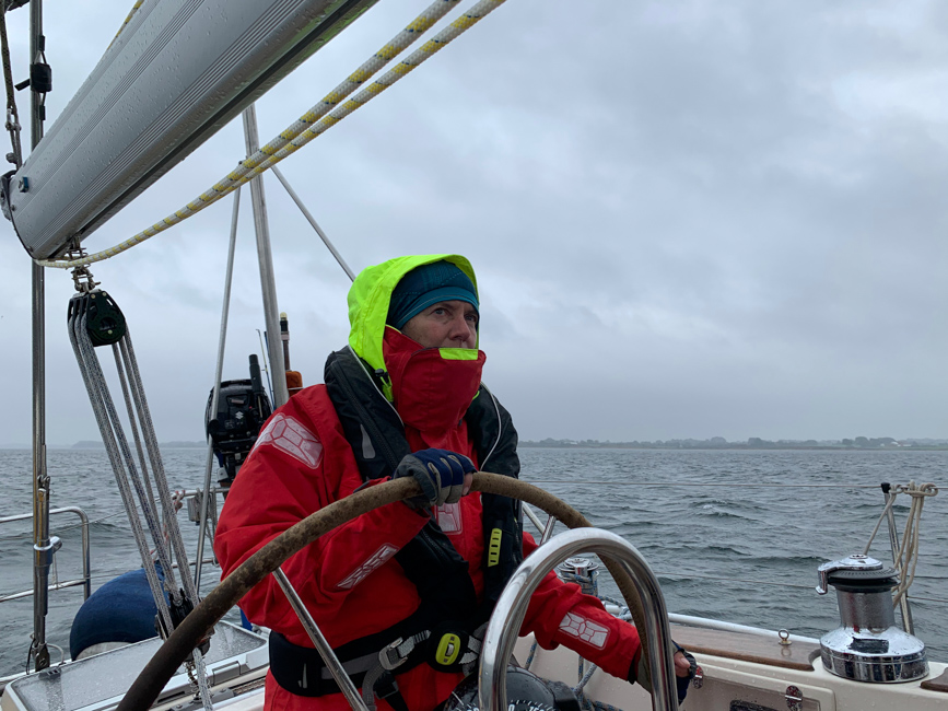Nach einem kurzen Regenguss legen wir in Kalvø ab, es bleibt verhangen, das Ganze wirkt etwas bedrohlich, obschon die Bedingungen zum Segeln einfach sind.