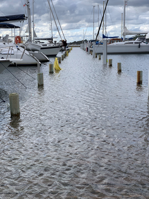 Zurück beim Schiff ist der Steg 10 cm überflutet. Im Laufe des Abends steigt das Wasser auf dem Steg bis etwa 20 cm an, gegen 20:30 kommt die «white deer», sie sind froh um unsere Hilfe beim Anlegen.