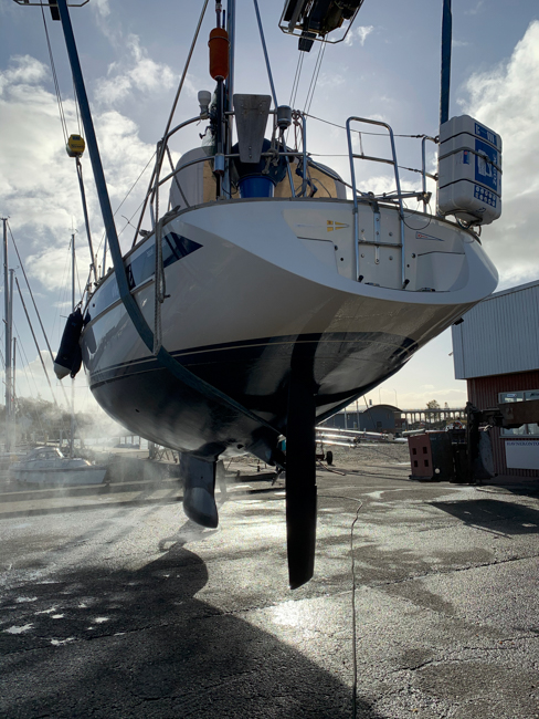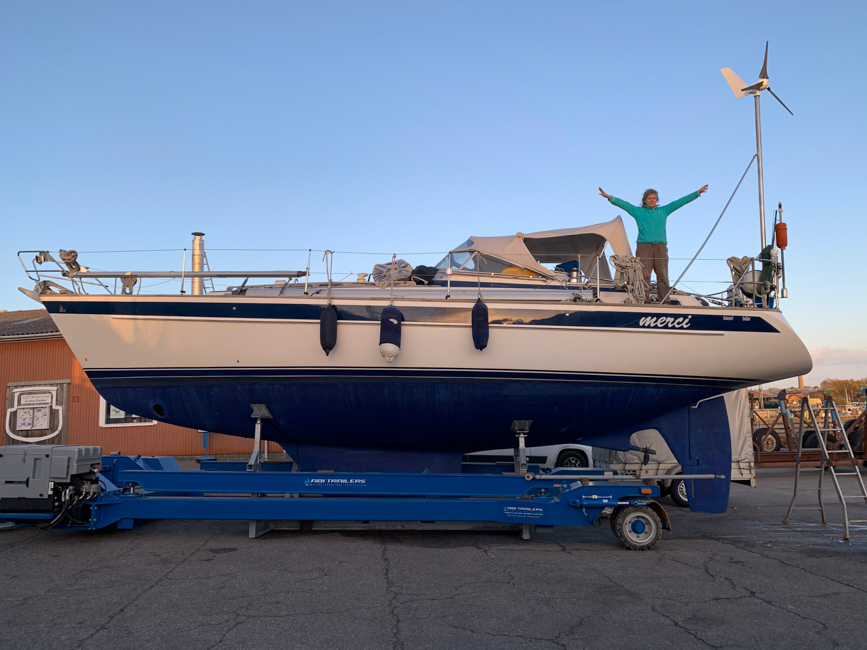 Di 3.11.20: Kranen. Das geht zackig, Claus und Jesper sind ein eingespieltes Team, um 12 Uhr steht das Schiff an Land.