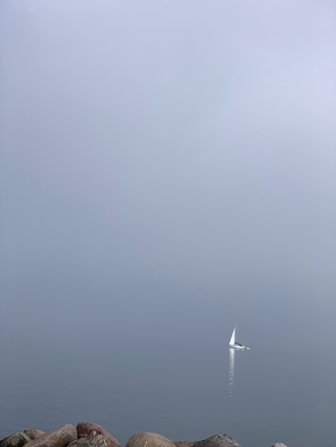 Eine graue Nebelwand schiebt sich am nächsten Tag unterwegs an uns heran und umhüllt uns, Meer und Horizont verschmelzen ineinander, der Wind schläft ein. In der grossen Marina in Bogense stehen die Dalben nur etwa 3.40 m auseinander, nach mehreren Anläufen passen wir doch noch in einen Platz (3.60m). In DK herrscht ab heute Maskenpflicht in den öffentlichen Einrichtungen, die Fallzahlen steigen.