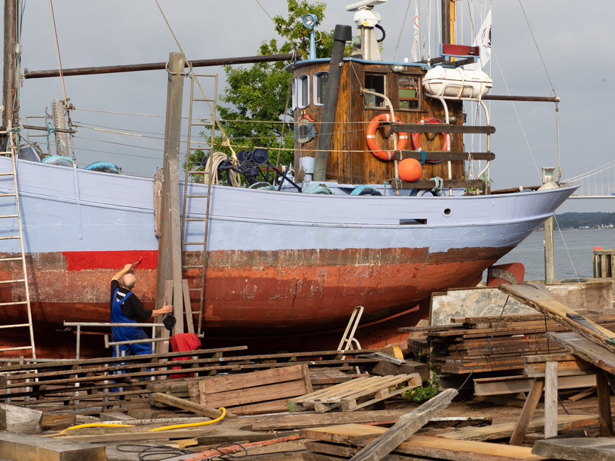 Eine sehr gemütliche Fahrt unter Segel bringt uns nach Fredericia, hier hat es viele Schweinswale, sie sind geschützt, nachdem sie früher abgeschlachtet worden sind wegen ihres Trans. Wir fahren zum Gamle Havn von Fredericia. Es ist cool hier, eher unser Stil, es hat etwa für 10 Boote Platz.