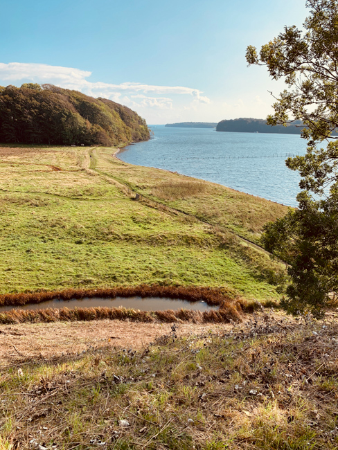 Wir segeln nach Korshavn, einer runden Naturbucht, whow! Es darf geankert werden, wir gehen an den Steg. Ein Vogelreservat, ein Rundweg hinauf zu Steilklippen, eine der schönsten Gegenden Dänemarks, jedenfalls zu dieser Jahreszeit, paradiesisch! Diese Ruhe, dieser Frieden! Einige Gleitschirmsegler geniessen die Aussicht von oben.