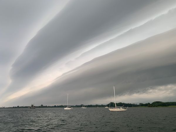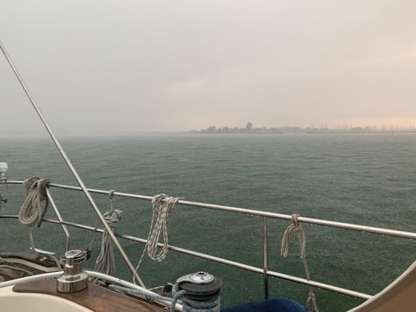 Eigentlich wollten wir heute um 8 Uhr los, ein Gewitter ist im Anzug, wir lassen es regnen und fahren gegen Mittag los. Es wird ein schöner Segeltag. Etwas stressig ist die Einfahrt im Olympiahafen Schilksee, es windet böig, eine Regatta ist im Gange, sonst sind auch noch viele Schiffe unterwegs. Der Olympiahafen von 1972 ist riesig, wird aber rege benutzt, im Gegensatz zu anderen Olympiabauten weltweit. Wiedersehensfreude mit Saskja und Ingo, was wir uns immer zu erzählen haben...