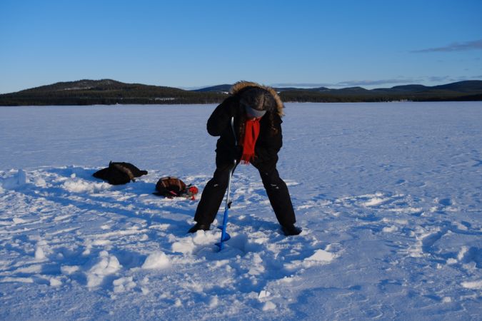 Wunschprogramm am letzten Tag: wir entscheiden uns heute für einen gut 20km langen Hundeschlitten-Vormittag. Sandrine führt uns durch eine eher flache Gegend, Seen wechseln sich mit Wäldern und Mooren ab. Am Nachmittag versuchen wir uns im Eisfischen. Wir bohren Löcher, legen oder setzen uns bei -10 Grad daneben und lassen die kurze Rute ins Loch gleiten. Die Sonne verschwindet etwa 17 Uhr hinter dem Wald, es wird empfindlich kalt, wir packen unsere Sachen zusammen, die Fische lassen wir im See. Ein friedlicher letzter Tag.