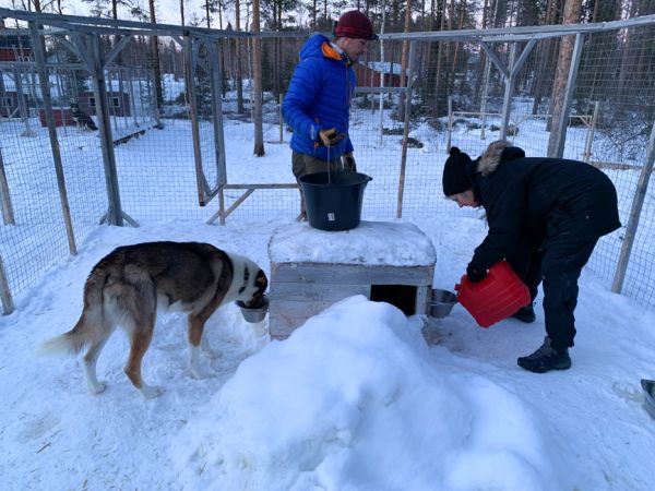 Fürs Abendessen (Trockenfutter in etwas Suppe) bringen wir sie anschliessend in ihre Zwinger, wo sie auch die Nacht verbringen, ausser es wird zu kalt, dann dürfen sie in einen «Stall».