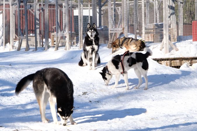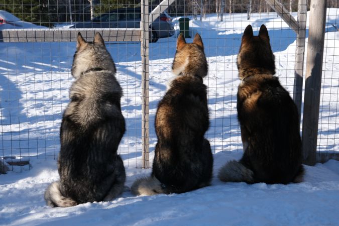 Wir fahren los, jede(r) von uns ein «Musher», über gefrorene Seen, durch Wäldchen und Moore; bei Sonnenschein und -9 Grad, fantastisch; die je 4 Hunde ziehen unermüdlich den Schlitten mit uns. Wir kommen nach 2 Stunden zurück, knapp 25 km, befreien die Tiere von der Zugleine, vom Brustgeschirr. Einige legen sich erschöpft hin, andere wandern herum, machen einen zufriedenen Eindruck. Wir bringen sie anschliessend in ihre Zwinger und geben ihnen zum Mittagessen Suppe; sie warten geduldig, bis ihr Napf gefüllt ist, kein Gerangel, kein Gebell.