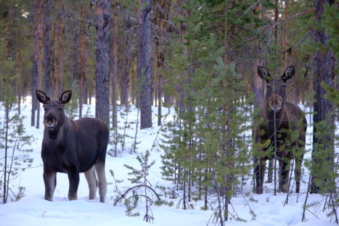 Auf der Heimfahrt sehen wir in etwa 100 Meter Entfernung ein paar Rentiere grasen, etwas später nimmt ein Elch-Muttertier mit zwei Jungen den Fototermin wahr.
