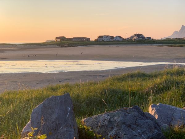 Nach dem Kapp Bergneset biegen wir nach Steuerbord ab. Völlig andere Szenerie, Häuser, Dörfer, lieblich die Berge. Kaum angelegt in Ramberg, werden wir freundlich begrüsst von eine Gemeinde-Angestellten mit der Bitte, zu bezahlen, viele Touristen würden das leider «vergessen»! Wir sind voller Energie heute, am längsten Tag, wandern auf den Knubben, und geniessen die Aussicht. Gegen Mitternacht, am schönen Sandstrand mit fast weissem Sand schauen wir der nicht untergehenden Sonne zu. Grosse Brachvögel fliegen aufgeregt umher. Ein geschenkter Tag.