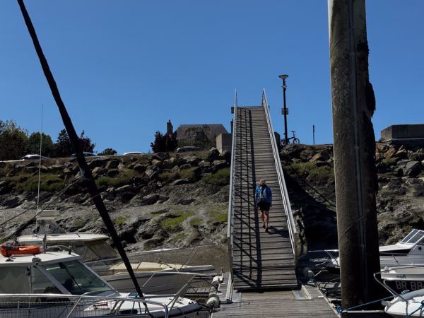 Wir motoren zum Fluss Jaudy. Nun, bei fast Niedrigwasser, ist die an sich breite Einfahrt gespickt mit Felsen, das Fahrwasser jedoch gut betonnt. Flussaufwärts wird es immer enger, viele Muschelfarmen sehen wir beidseits am Ufer. Stellenweise haben wir nur 2.6 Meter Wasser unter dem Kiel, wir sind konzentriert, melden uns per Funk in Tréguier an, wir werden zum Ponton eskortiert, legen an, es ist Niedrigwasser, keine Stömung, perfekt!