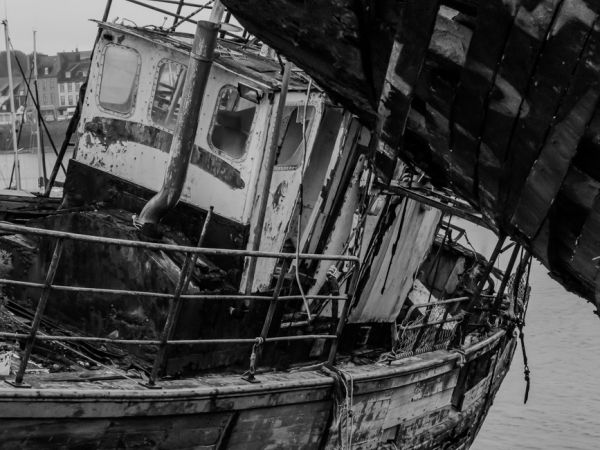 Bei leichtem Nieselregen treiben wir friedlich zur Mündung, wo uns unangenehmer Gegenwind mit 13 Knoten empfängt. In der weiten Bucht von L’Auberlac’h fällt der Anker, der Gezeitenunterschied beträgt 6 Meter, enorm.