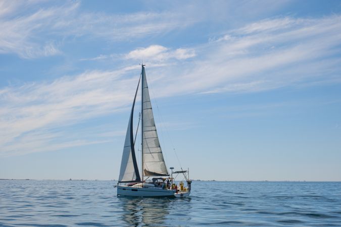 Die Sonne weckt uns, wir fahren hinaus aufs Meer, und werden von Nebel eingehüllt, starten den Radar. Um 10 Uhr rollen wir die Segel aus und bald vertreibt die Sonne den Nebel. Beim Leuchtturm «Le Four» (Chenal du Four) schiebt der Strom uns mit knapp 2 Knoten. Beim «Grande Vinotère» haben wir 10.5 Knoten Fahrt, kaum Welle, herrlich!