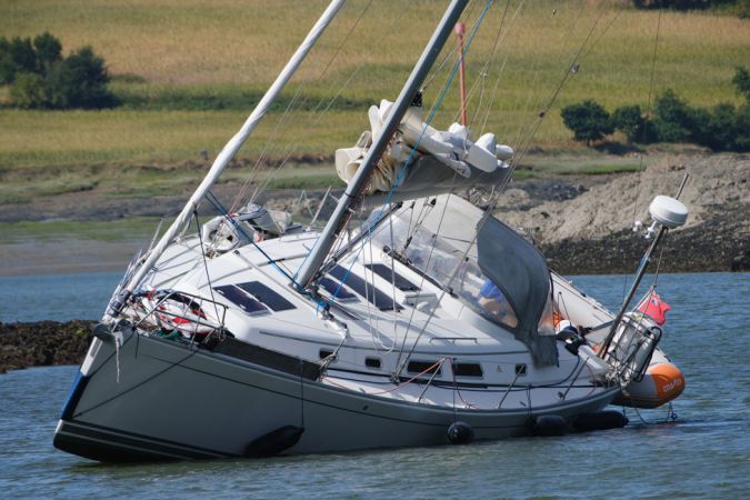 Die Vollmondnacht ist kühl, am Morgen scheint die Sonne vom wolkenlos blauen Himmel und wärmt, Frühstück im Cockpit. Eine Segeljacht hat die Seezeichen nicht richtig interpretiert und sitzt nun 4 Stunden lang schräg auf einer Sandbank.