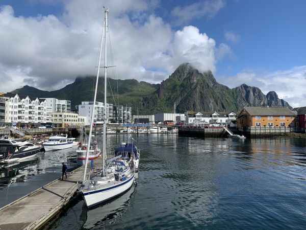 Gemütlich segeln wir mit raumem Wind nach Lødingen, machen am Schwimmsteg im Nordhafen fest, der Gezeitenunterschied beträgt gut 2 Meter; Strom gibt es, Toilettenanlagen nicht, die Hafengebühr bezahlen wir in der Apotheke. Im Hafen steht Schwell bei leichtem Nordwind, keine Traumdestination. Lødingen bietet als Besonderheit ein privat geführtes Kino, leider hat die Kinosaison noch nicht begonnen, wir verproviantieren uns im gut bestückten «coop».