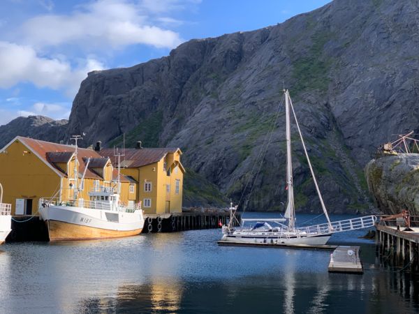 Gross und Genua werden gehisst, herrliche 10nm segeln wir gegen Osten. Dann setzt Regen ein, der Wind nimmt ab, wir drehen den Zündschlüssel und bergen die Segel. Die Einfahrt nach Skrova ist verwinkelt, der Hafen daher gut geschützt. Der Steg macht nicht mehr einen sehr soliden Eindruck, das heimelige Restaurant, «HeimBrygga» beim Fähranleger hinterlässt einen guten Eindruck. Wir kommen wieder!