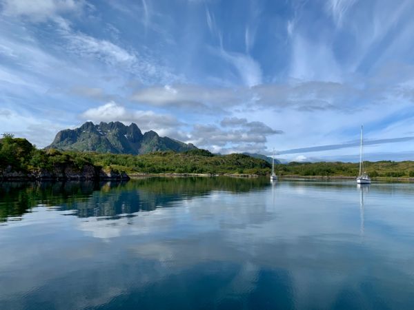 Es ist leicht bewölkt, wir kommen mit der Genua vorwärts, nach kurzer Zeit schläft der Wind ein, dafür gibt es Regen. Roger hängt den Köder ins Wasser, ein Dorsch (40 cm lang) beisst, wir bringen ihn an Deck, das Abendessen ist gesichert. Nun fahren wir durch unangenehme Wellen und Dünung hinein in die verwinkelte, gut geschützte Bucht von Laukvika und machen am Besuchersteg fest.