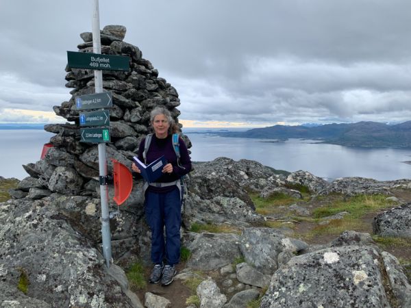 «Bufjellet» (469müM): die Temperaturen auf dem Gipfel erfordern Mütze und warme Jacke. Wir tragen uns ins Gipfelbuch ein und nehmen den Abstieg in Angriff. Upps, Eierschwämme en masse, Menüänderung: Pilzrisotto statt Lachs.