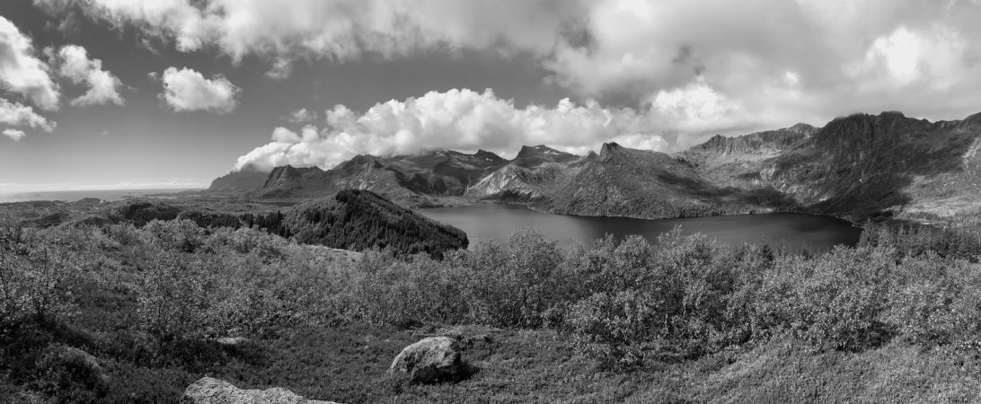 Tags darauf zieht es uns auf den Berg. Nach etwa 250 Metern Aufstieg kommen wir zu einem Bergsee, eingebettet in malerische Umgebung. Typisch für Norwegen, es wird gebadet im kalten Wasser.... Ursula eilt noch auf den Peak, (Festvågtinden 541müM) die Aussicht ist phänomenal.