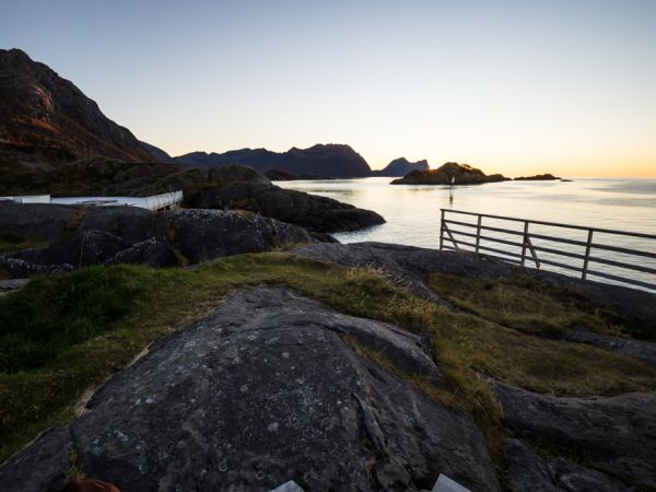 An Holzgestellen zum Fischtrocknen vorbei kommen wir vor eine steile Felswand, da beginnt der kaum sichtbare Pfad, rutschig, über blanke oder bemooste rutschige Felsplatten, definitiv keine Freude, weiter oben wird der Weg besser. Beim Sendeturm auf etwa 350müM als Belohnung Bilderbuch-Sicht auf Husøy! Zurück gehen wir auf der Fahrstrasse! Der Hafen ist um 16 Uhr schon im Schatten, wir legen ab und sind bald darauf im Fjord noch in der Sonne, im Abendlicht fahren wir entlang der Felsen, unglaublich schön.